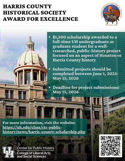 The Harris County Historical Society presents an annual award for excellence to an undergraduate or graduate student for a public history project focused on Houston or Harris County history. Submitted projects should be completed between June 1st, 2025 and May 15th, 2026.