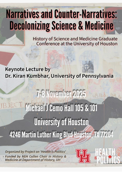 Narratives and Counter-Narratives: Decolonizing Science and Medicine is a graduate student conference to be held in 7th-8th November 2025 at the University of Houston. Narratives and Counter-Narratives is an inaugural conference organized by and for graduate students at the University of Houston. The goal of the conference is to foster conversations and provide a supportive interdisciplinary space for emerging scholars to present research, receive feedback and mentorship in this crucial time for our fields. The graduate conference is organized by the Project on Health is Politics, and funded by the NEH Cullen Chair in History and Medicine, Department of History at the University of Houston.