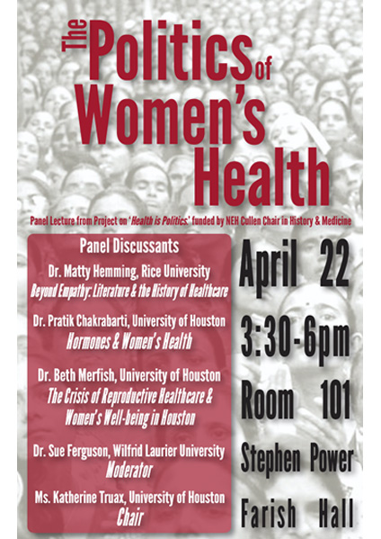 In Spring 2025, the Project on ‘Health is Politics’ hosted The Politics of Women’s Health, a panel lecture showcasing the scholarly contribution centering on the gendered nature of the politics of health. The event took place on April 22 with three talks given by following scholars: Dr. Matty Hemming, Rice University, on ‘Beyond Empathy: Literature and the History of Healthcare,’ Dr. Pratik Chakrabarti, University of Houston on ‘Hormones and Women’s Health’ and Dr. Beth Merfish, University of Houston on ‘The Crisis of Reproductive Healthcare and Women’s Well-being in Houston.’ The Panel was moderated by Dr. Sue Ferguson and Chaired by fellow grad student Ms. Katie Truax.