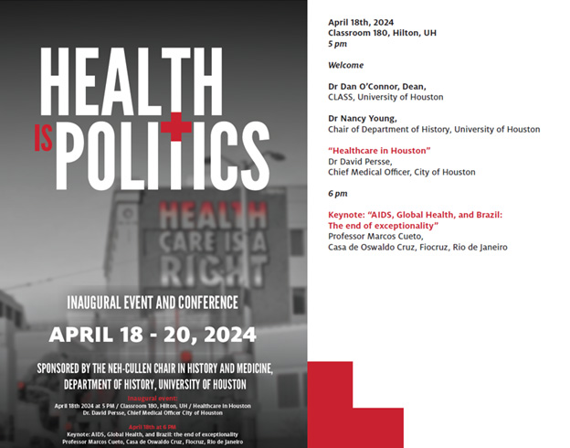 The launch event followed by a two-day conference of the Project on “Health is Politics” of the NEH-Cullen Chain in History & Medicine, will be held on April 18th to 20th, 2024 at the Hilton, University of Houston.