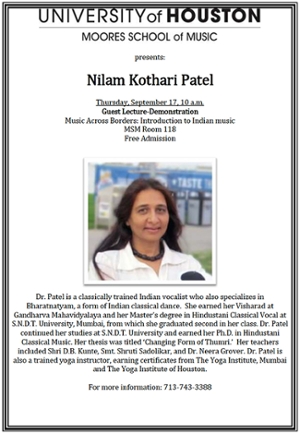 Dr. Patel is a classically trained Indian vocalist who also specializes in Bharatnatyam, a form of Indian classical dance. She earned her Visharad at Gandharva Mahavidyalaya and her Master's degree in Hindustani Classical Vocal at S.N.D.T. University, Mumbai, from which she graduated second in her class. Dr. Patel continued her studies at S.N.D.T. University and earned her Ph.D. in Hindustani Classical Music. Her thesis was titled ‘Changing Form of Thumri.’ Her teachers included Shri D.B. Kunte, Smt. Shruti Sadolikar, and Dr. Neera Grover. Dr. Patel is also a trained yoga instructor, earning certificates from The Yoga Institute, Mumbai and The Yoga Institute of Houston.