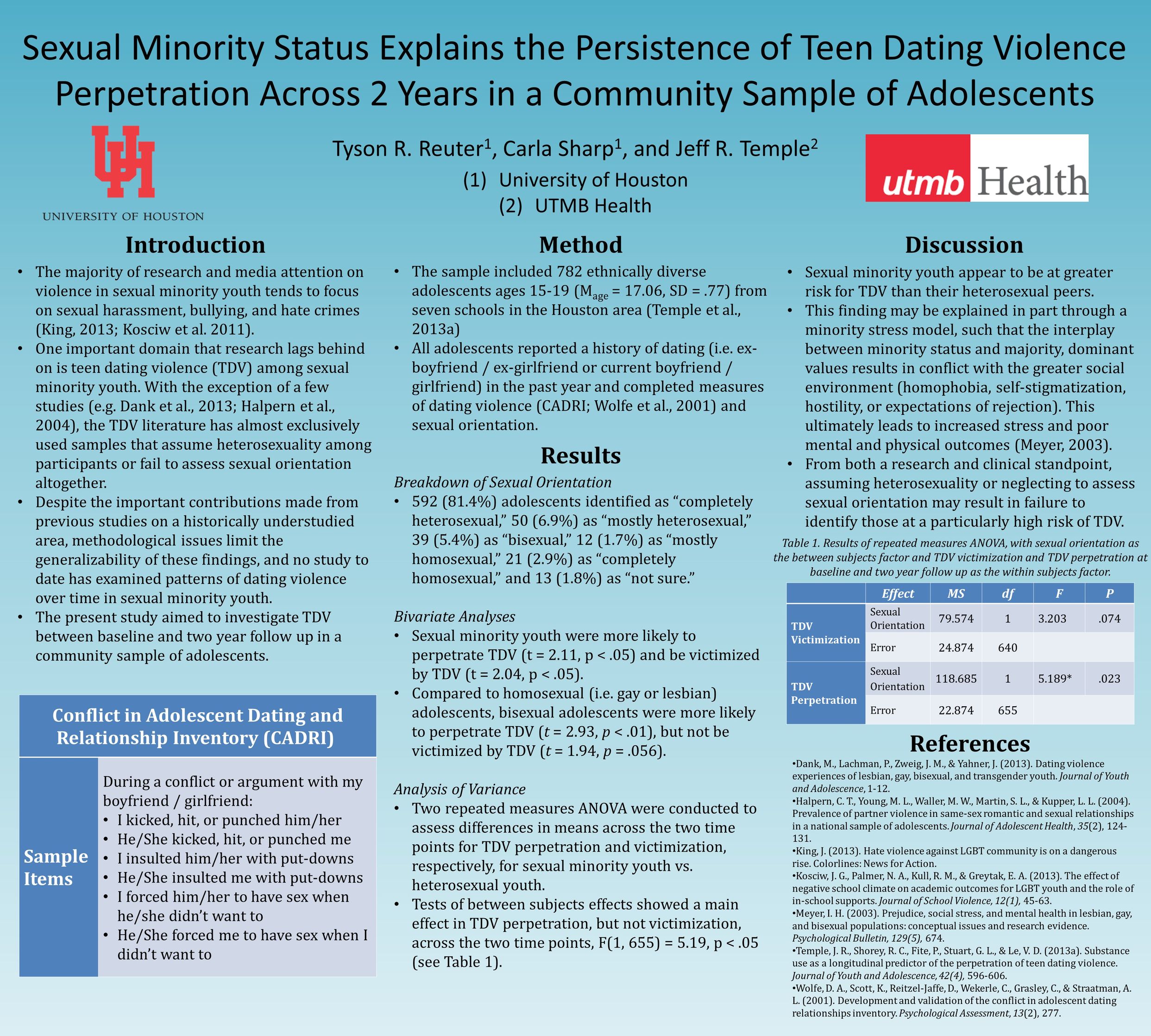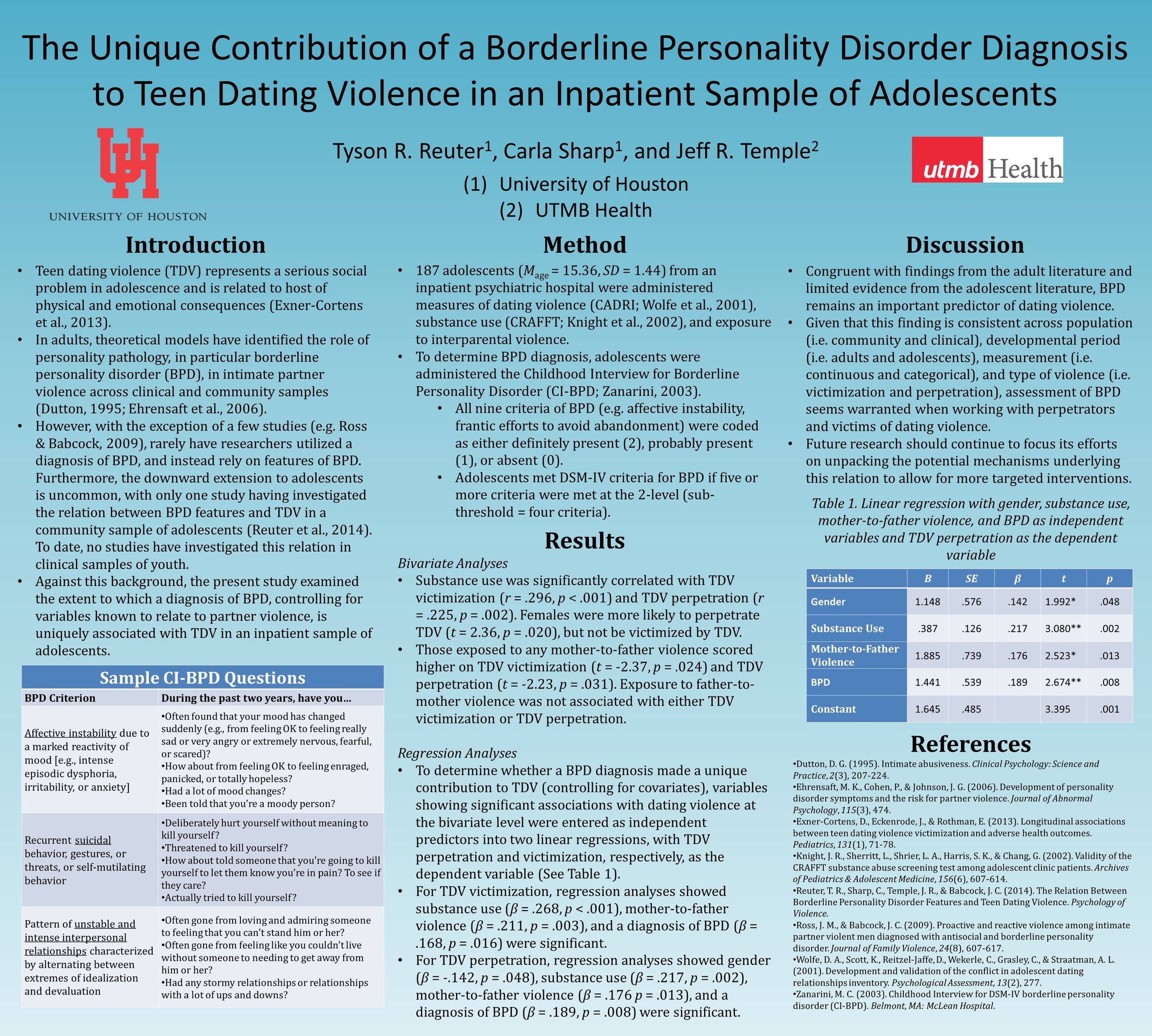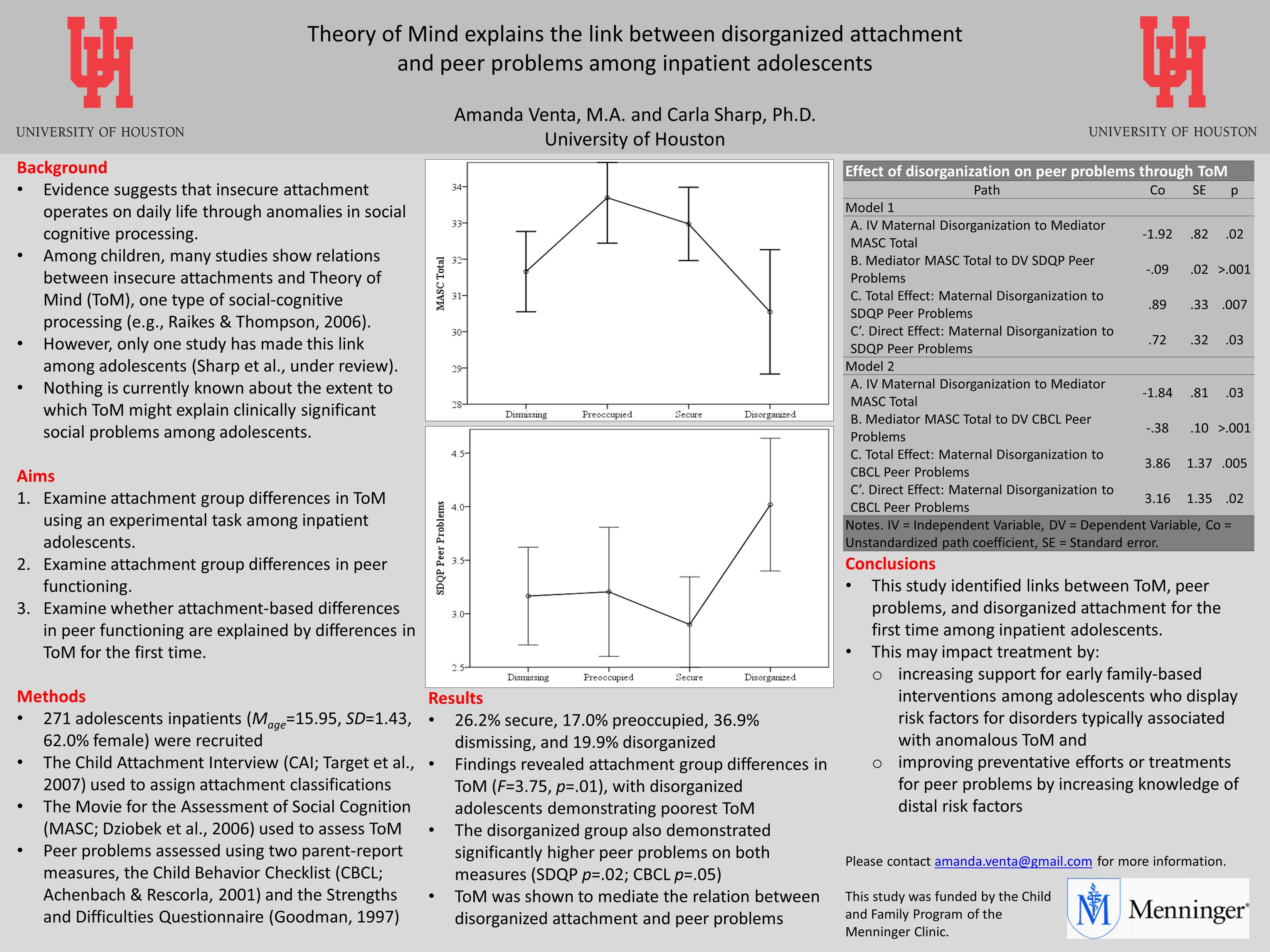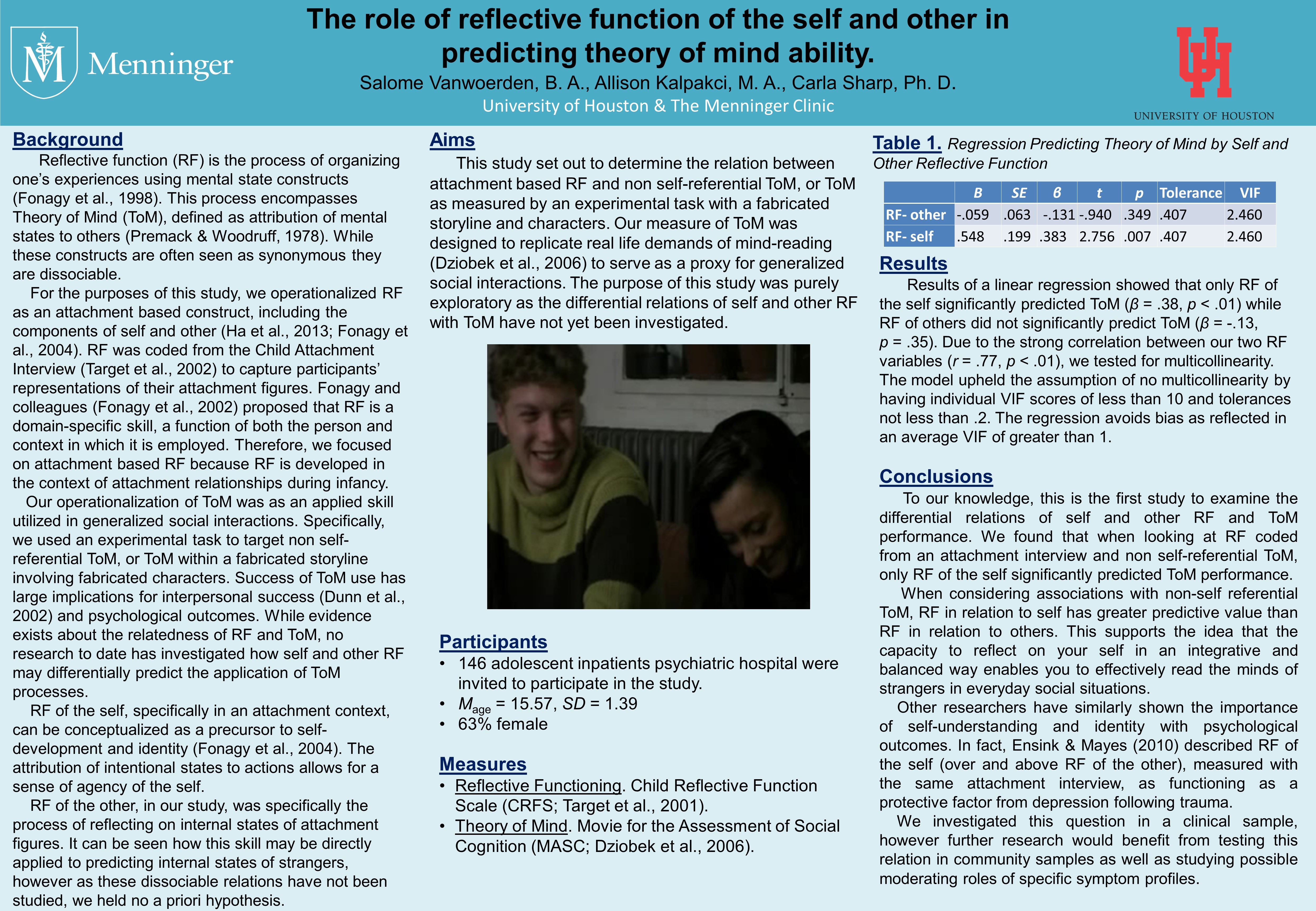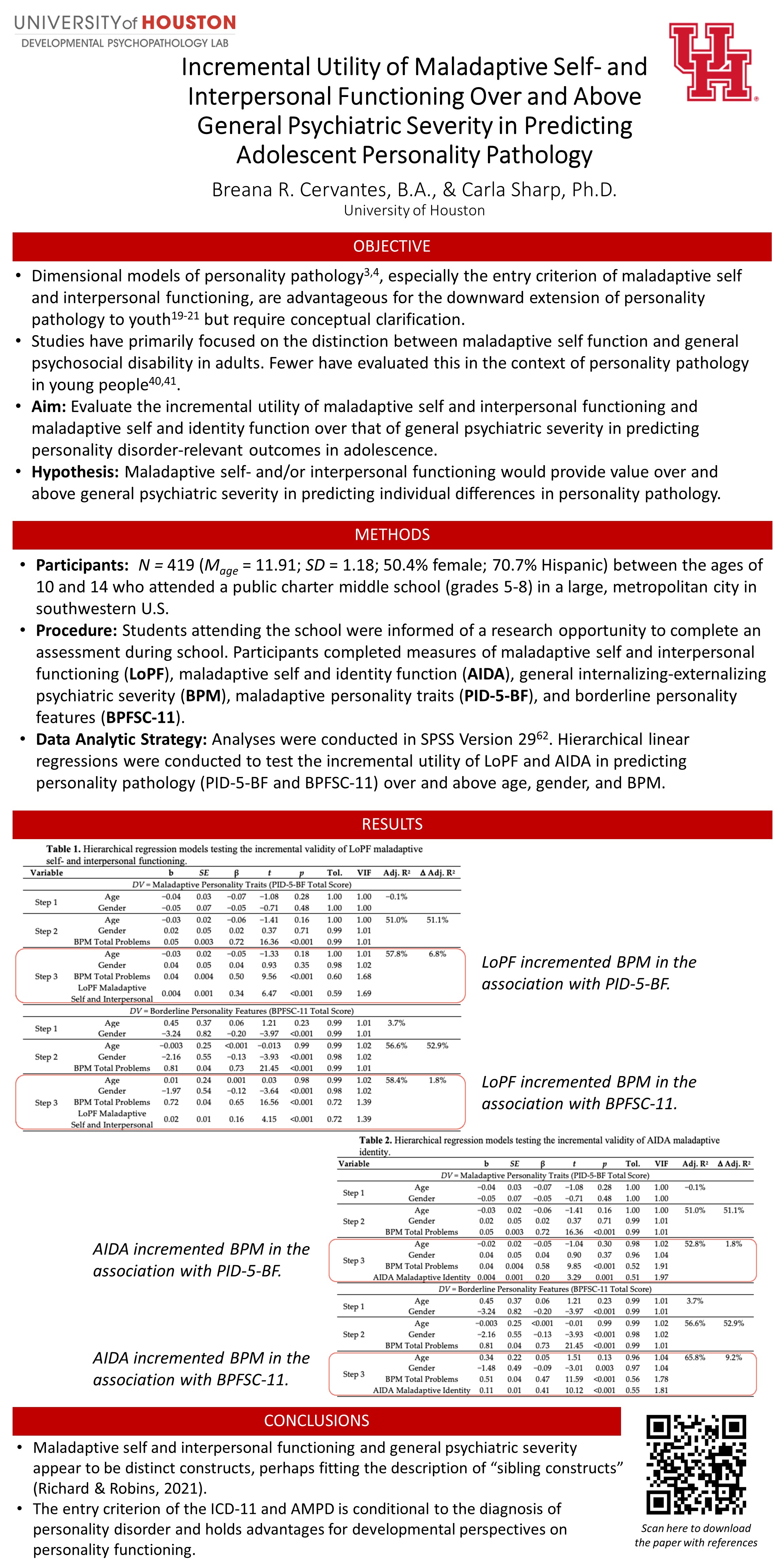 Lab Posters Qualifying Children’s Home Environment in Intimate Partner Violence Rehousing Programs: Implications for Child Psychopathology /class/psychology/clinical-psych/research/dpl/_files/posters/abct-2014_theory-of-mind.jpg ABCT 2014 Theory of Mind NASSPD 2023 Incremental Utility of Maladaptive Self- and Interpersonal Functioning Over and Above General Psychiatric Severity /class/psychology/clinical-psych/research/dpl/_files/posters/srp-2014_the-role-of-reflective-function-in.jpg /class/psychology/clinical-psych/research/dpl/_files/posters/tpa-poster-rf-and-symptom-changes_10.20.14.jpg SRP 2014 The role of reflective function TPA poster RF and symptom change /class/psychology/clinical-psych/research/dpl/_files/posters/abct-2014_sexual-minority-status.jpg /class/psychology/clinical-psych/research/dpl/_files/posters/abct-2014_the-unique-contributionof-bpd.jpg ABCT 2014 Sexual Minority Status ABCT 2014 The unique contributionof BPD ABCT 2014 Exploring the clinical utility of ABCT 2014_Expressed emotion and adolescent depression ABCT 2014_Earned Secure ABCT 2014 Experiential Avoidance Predicts Teen Dating Violence APA 2014: Hypermentalizing, Self-Injurious Behaviors, and Treatment Response in Psychiatric Adolescents APA 2014: The Relations Among Psychiatric Adolescents' Emotional Trust, Depression, and Suicide Attempts ABCT 2013: Borderline Personality Disorder in adolescence: Externalizing comorbidity and cutting NASSPD 2013: The Relation between Borderline Personality Disorder Features and Teen Dating Violence Victimization in Adolescence ABCT 2012: Evidence for Poor Reflective Function in Adolescents with Borderline Personality Disorder ABCT 2012: The Relations between Multiple Indices of Aggression in Borderline Personality Disorder Features in Adolescents ABCT 2012: A Behavioral Economics Assessment of Interpersonal Trust among Adolescents with ODD ABCT 2012: Attachment in Adolescence: Dimensional and Categorical Use of the Child Attachment Interview SWPA 2012: Criterion Validity of MSI-BPD URD 2012: Nonverbal Trust Study ABCT 2011: BPD symptom change ABCT 2011: BPD traits and Aggressive Subtypes ABCT 2011: Outcomes Incentives ABCT 2011: Experiential Avoidance, Alexityhmia, and Emotion Regulation ABCT 2011: BPD, Experiential Avoidance, and Emotion Dysregulation ABCT 2011: Emotion Regulation and Self-harm ABCT 2011: The Reflective Function Questionnaire for Youths ABCT 2011: Suicide SIG Attachment and Self-Harm APA 2011: BPD and Trauma TPA 2011: Psychometric Properties of the CI-BPD TPA 2011: Axis I Comorbidity in patients with BPD SN 2011: Downward Extension of the Trust Task SN 2011: Better the devil you know SSSS 2011: Sexual Concerns and Trauma in BPD ABCT 2010: Parent and Child Mentalization in Conduct Problems ADAA 2010: Experiential Avoidance and Anxiety ABCT 2010: Predictive power of parent vs Self Report ABCT 2010: Sensitivity and Specificity of the AFQY