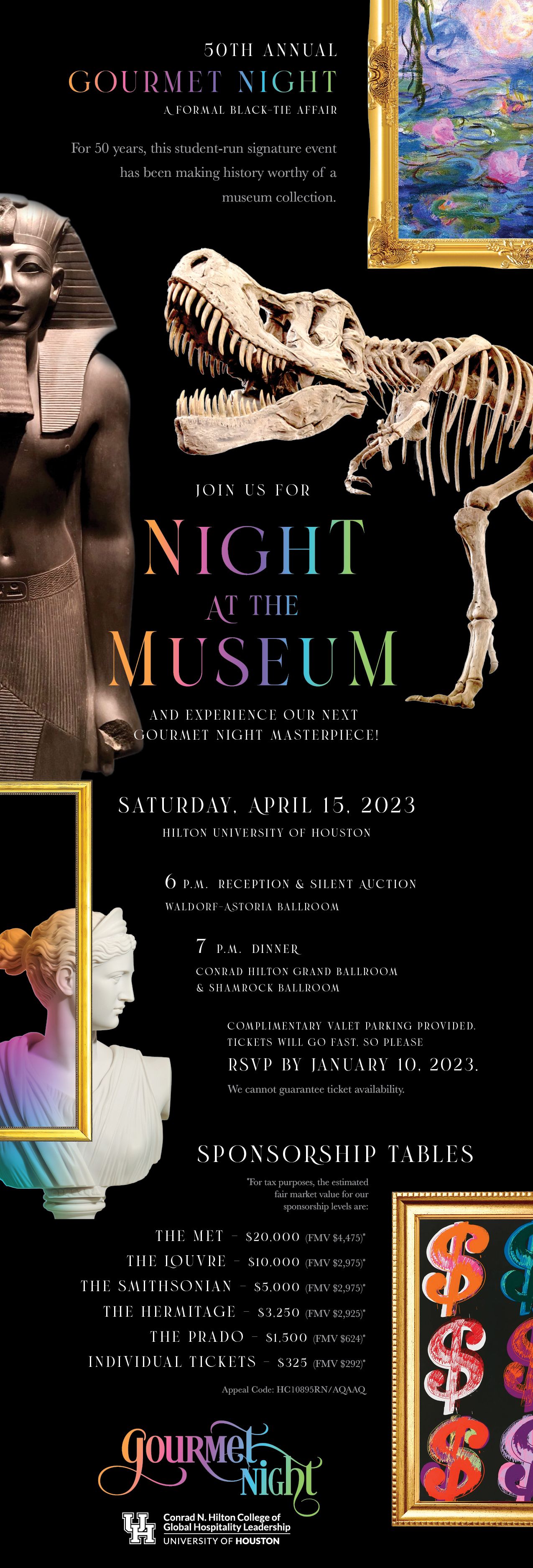 For 50 years, this student-run signature event has been making history worthy of a museum collection. Join us on April 15, 2023 for our 50th Annual Gourmet Night to experience the next masterpiece!