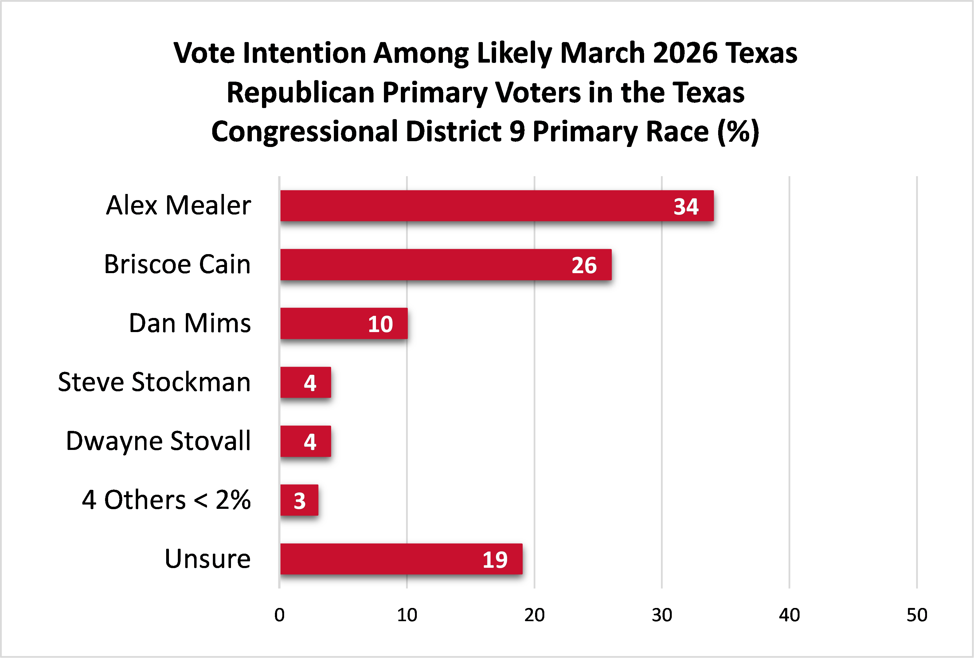 In the Republican primary for Texas Congressional District 9, Alex Mealer leads Briscoe Cain among likely voters, 34% to 26%, followed by Dan Mims with 10%. Nearly one-fifth (19%) of the respondents are undecided.