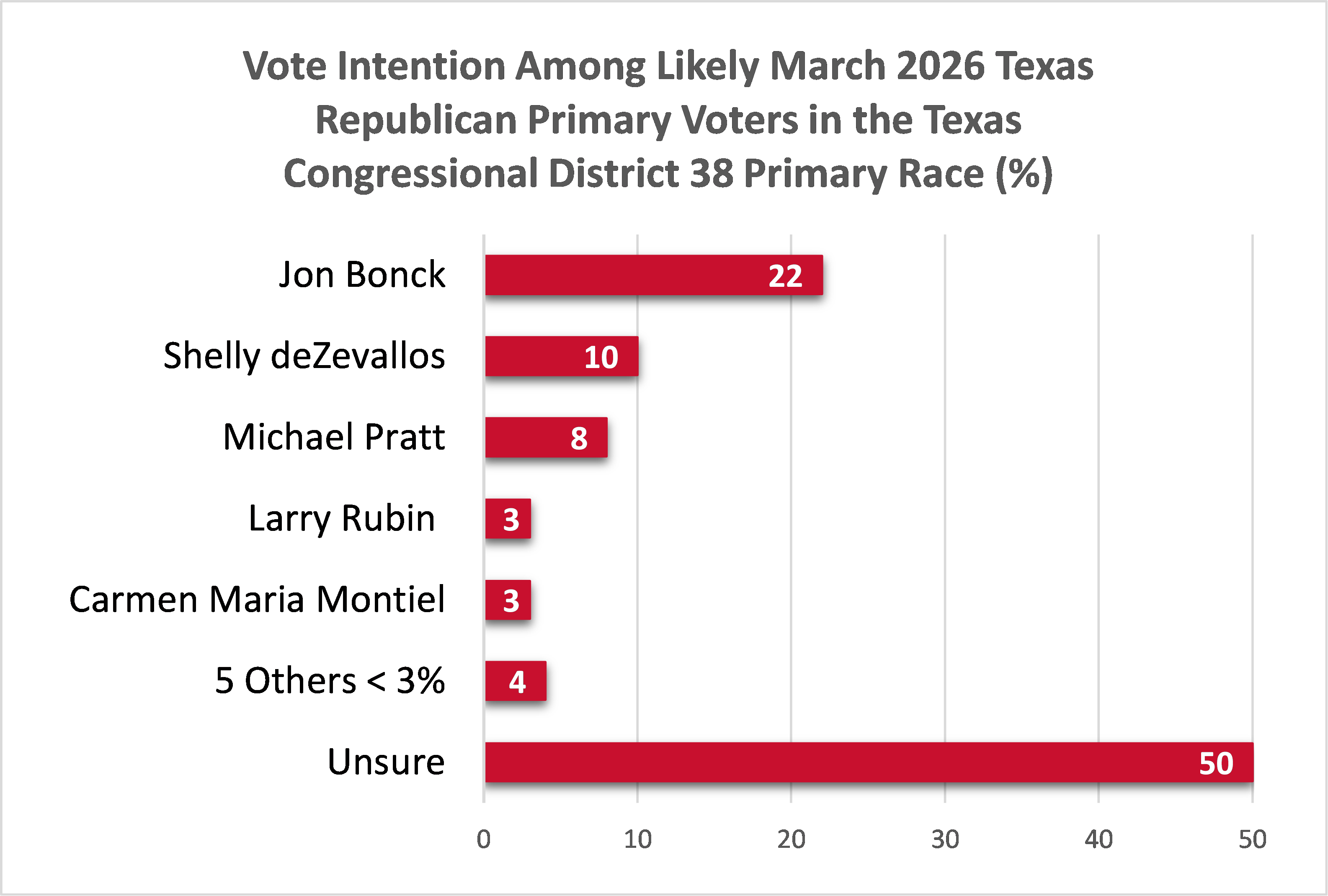 Half (50%) of voters in the GOP primary for Congressional District 38 remain undecided. Jon Bonck leads with 22% of the vote, followed by Shelly deZevallos (10%) and Michael Pratt (8%).