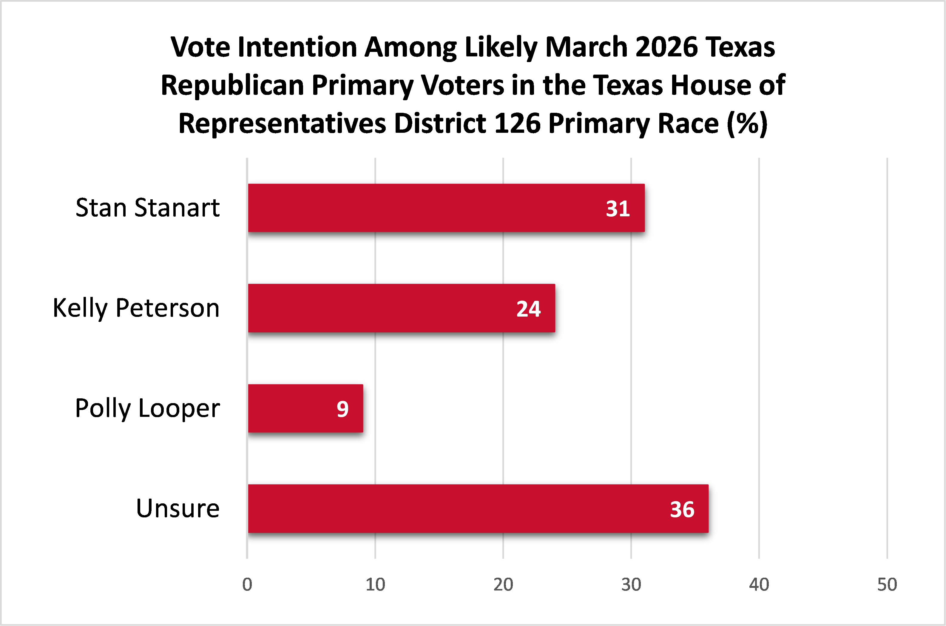 Stan Stanart leads in the Republican primary for Texas House District 126, with 31% of the vote. Kelly Peterson has 24%, while 36% are unsure.