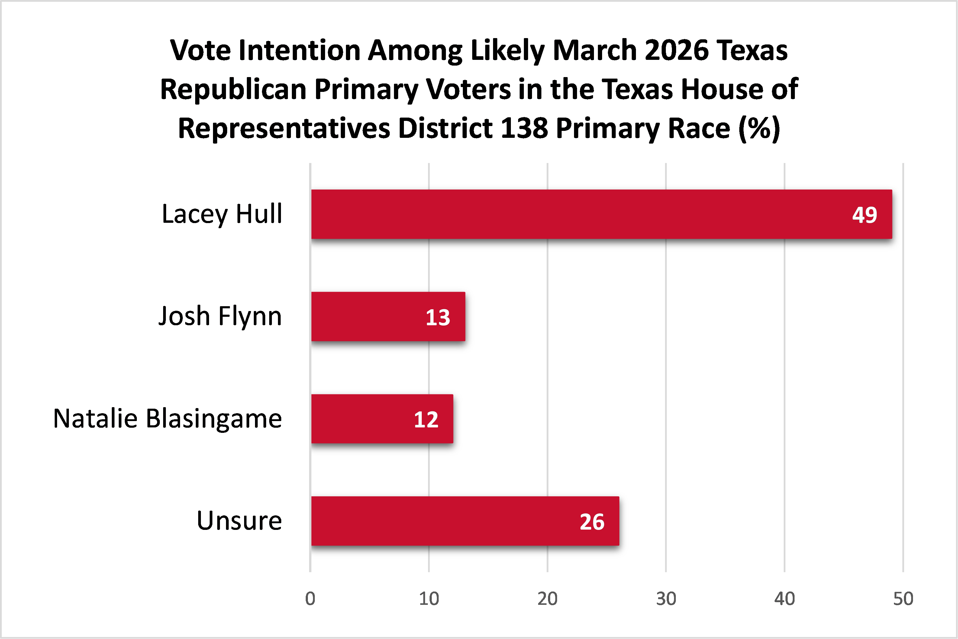 Incumbent state Rep. Lacey Hull leads in the GOP primary for Texas House District 138, with nearly half (49%) of the vote. Josh Flynn trails with 13% of the vote, while Natalie Blasingame has 12%. 26% are unsure.