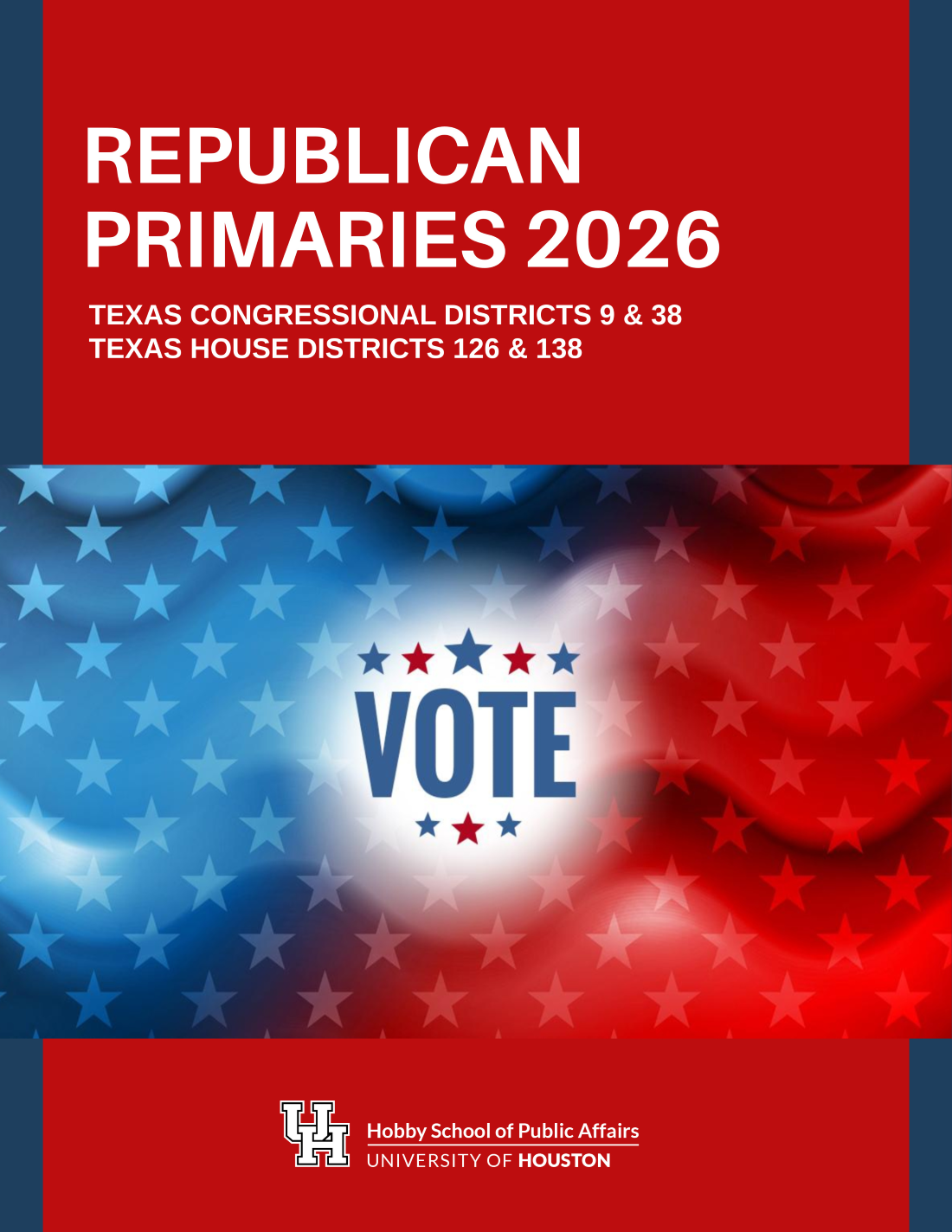 Read the report to learn more about where likely Republican primary voters stand on the 2026 primary candidates for Congressional Districts 9 and 38, including differences of opinion when considering gender, age, race/ethnicity, education and partisanship, and about the vote intention for the candidates in Texas House Districts 126 and 138.