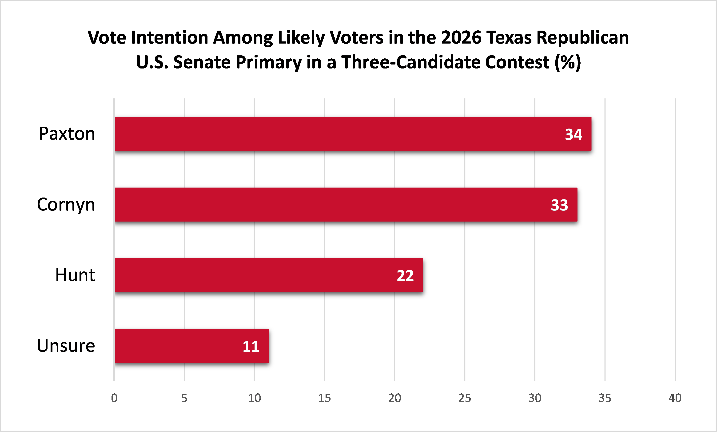 - In the 2026 Texas primary race for the Republican nomination for the U.S. Senate, the vote intention of likely primary voters is 34% for Ken Paxton, 33% for John Cornyn and 22% for Wesley Hunt, with 11% unsure.