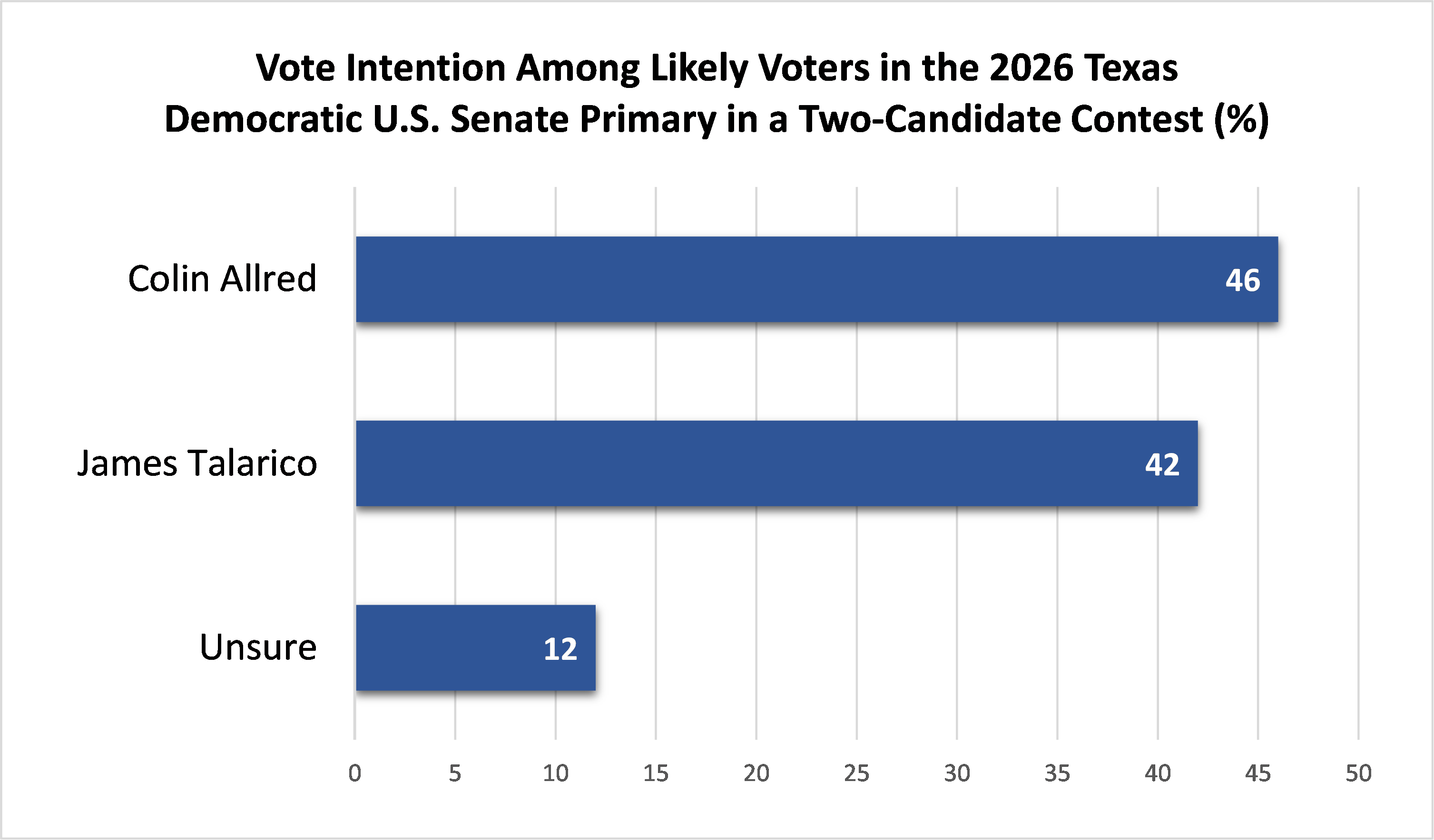 - The vote intention in the primary race for the Democratic nomination for the U.S. Senate has 46% of likely voters casting a ballot for Colin Allred and 42% for James Talarico, with 12% unsure.