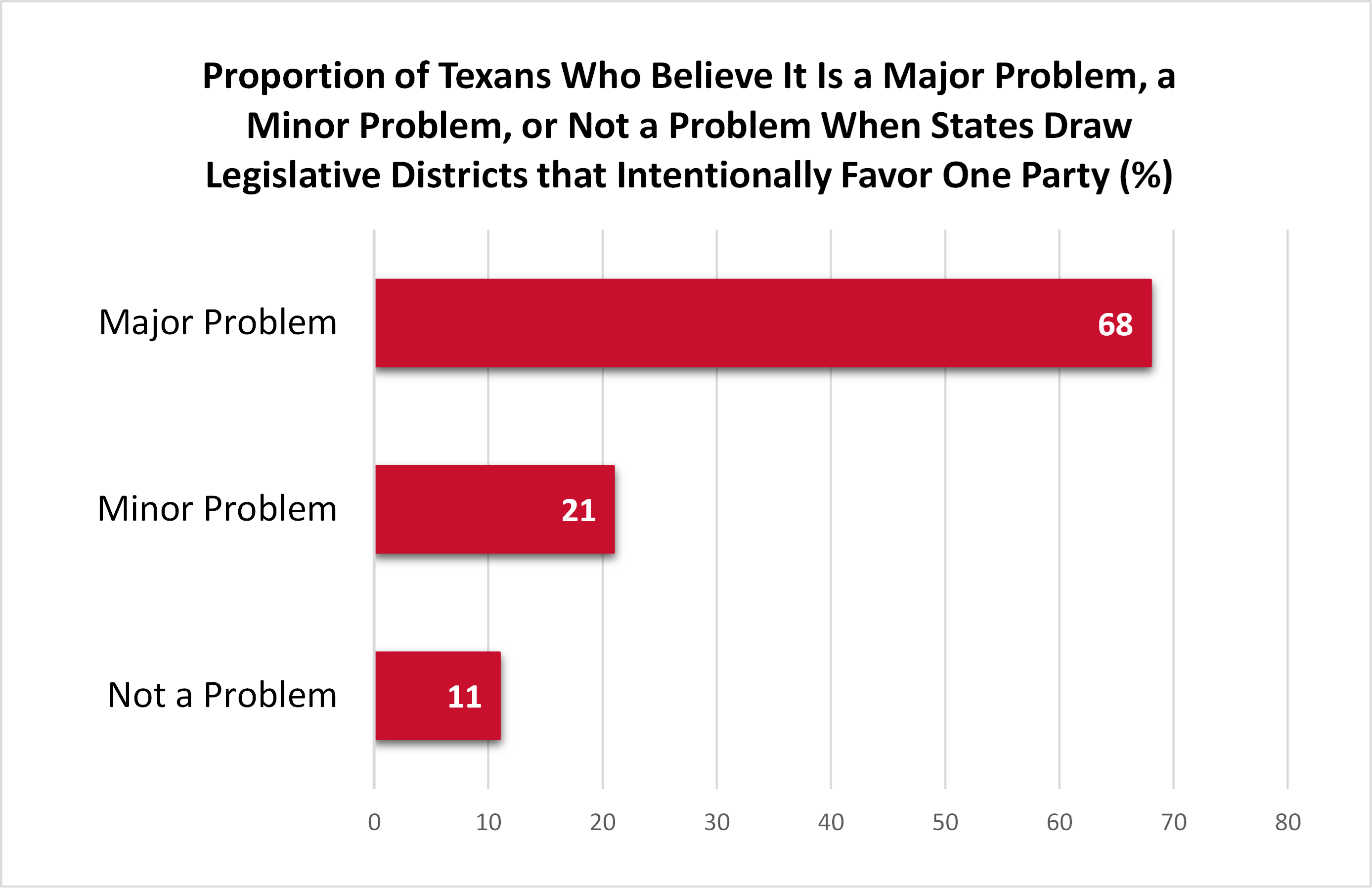 - 68% of Texas registered voters believe it is a major problem when states draw legislative districts that intentionally favor one party (i.e., engage in partisan gerrymandering) while 21% believe it is a minor problem and 11% believe it is not a problem.