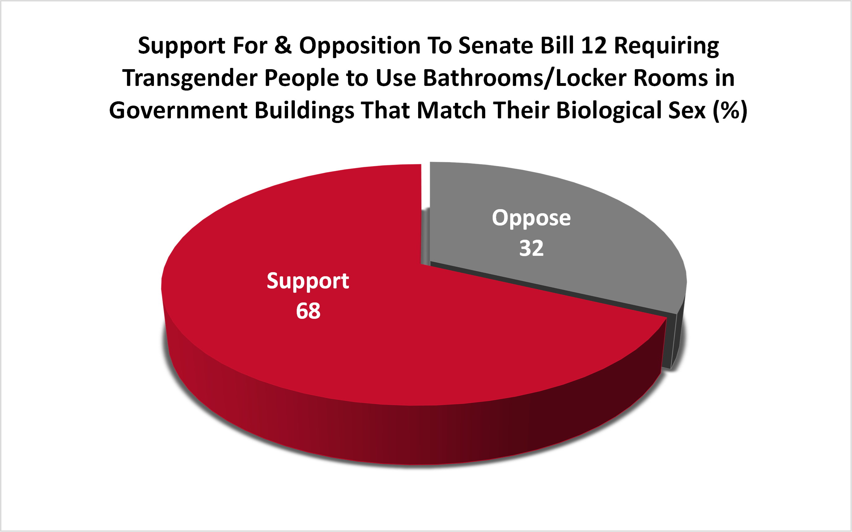 - 68% of Texas registered voters support (52% strongly) Senate Bill 8 from the Texas Legislature’s second special session that restricts the use of restrooms and locker rooms in government-owned and operated buildings, public schools and universities to those individuals whose biological sex matches that of the restroom or locker room.
