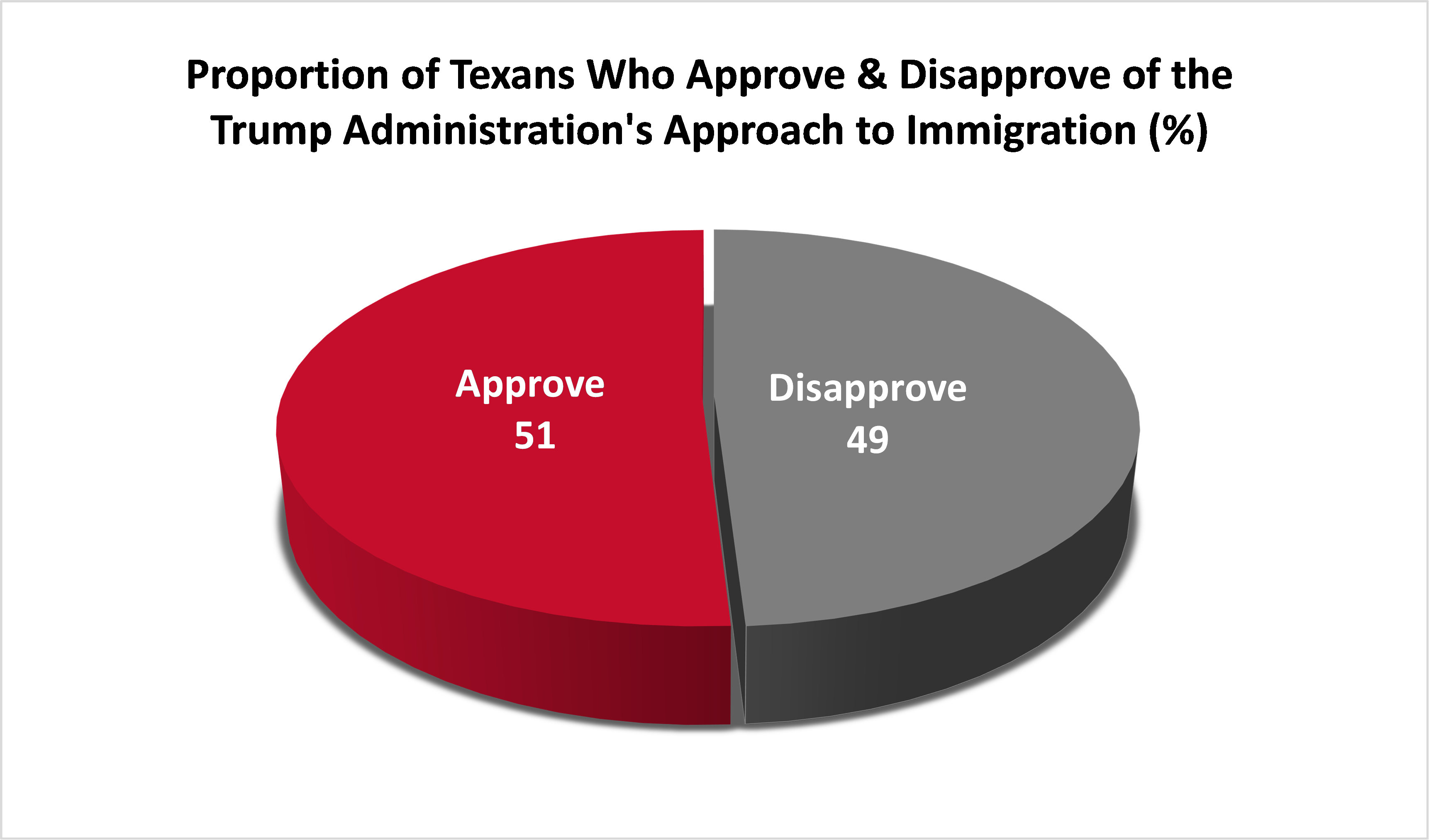 - 51% of Texans approve and 49% disapprove of the Trump Administration’s approach to immigration.