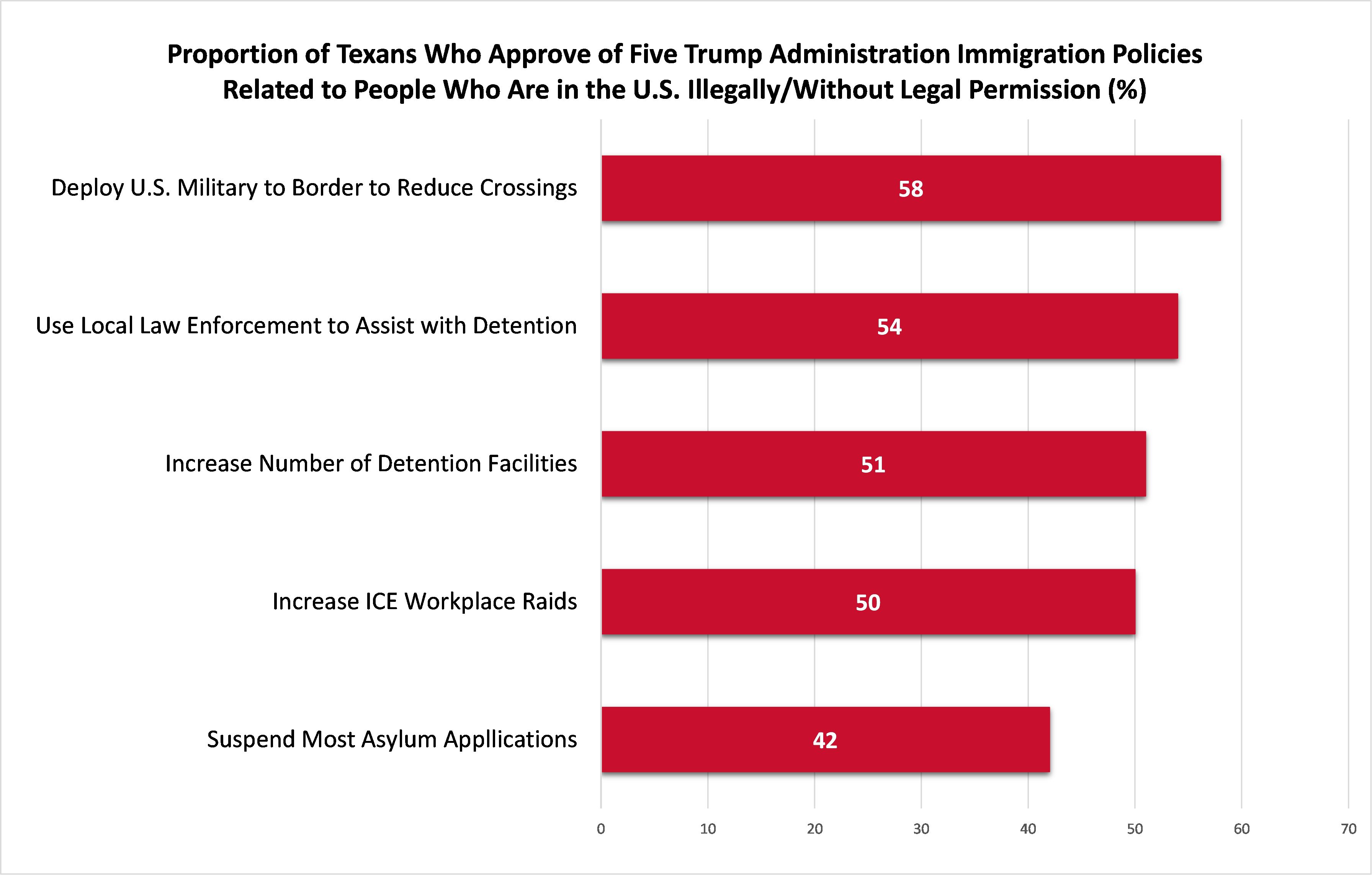 - 54% of Texans approve of the Trump Administration using state and local law enforcement to help with efforts to detain immigrants who are in the U.S. illegally/without legal permission.