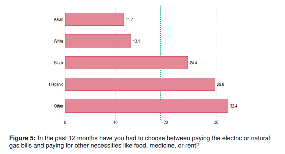 - Payment hardships: About 21% of Texans reported difficulty paying their energy bills at least three times in the past year, and 19% had to choose between paying for energy and essentials such as food, medicine or rent. Hardship rates were higher among Black (24%), Hispanic (30%) and other race/ethnicity (32%) respondents, compared with 13% of white and 12% of Asian households.