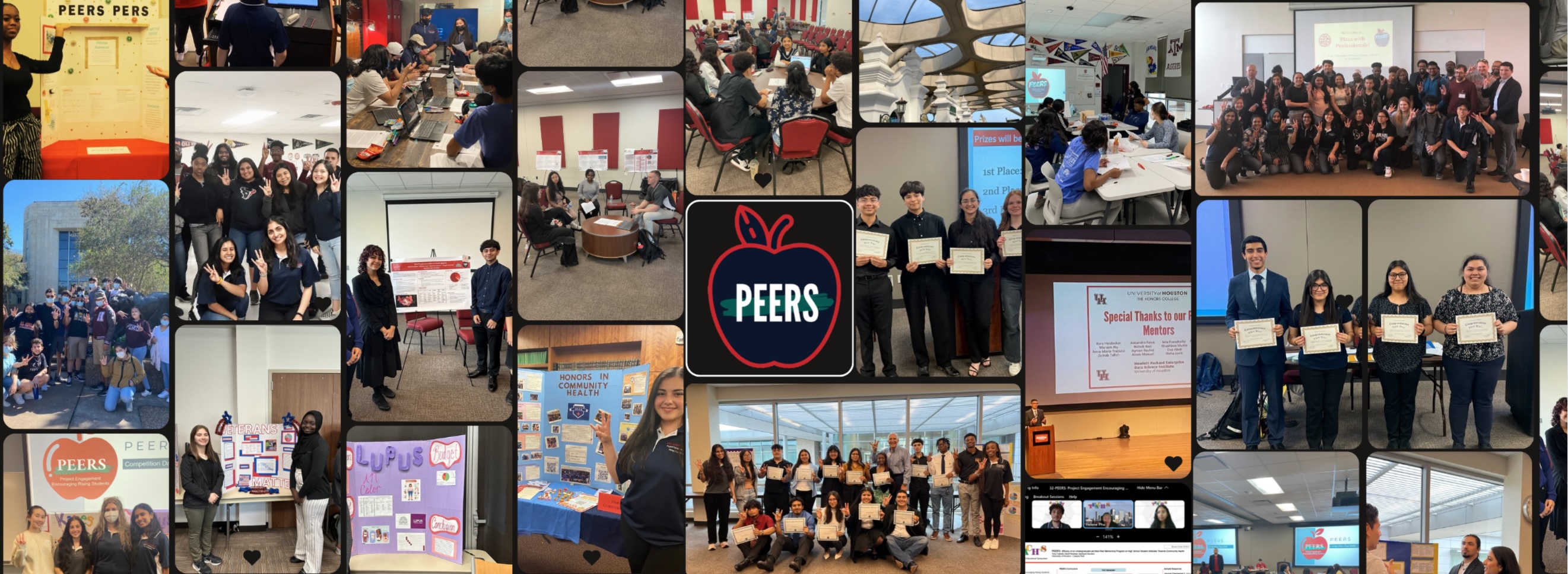 Project Engagement Encouraging Rising Students (PEERS), supported by the University of Houston, UH Honors College, UH CHWi, and the Hewlett Packard Enterprise Data Science Institute, focuses on encouraging STEM education and providing mentorship to underserved students in grades 9-12. PEERS grew from and embodies the model of Community Health Workers (CHWs) as simultaneous educators and advocates. Initially conceived in a CHW class, this program pairs high school students and the University of Houston undergraduates to create long-lasting, effective, and engaging community projects that are meaningful and relevant. In addition, facilitating community engagement through collaboration and project-based learning encourages both our undergraduate and high school participants to pursue academic and professional development to advocate for improved health outcomes in their communities. Each student team presents their final project at the PEERS competition to compete for a monetary prize.