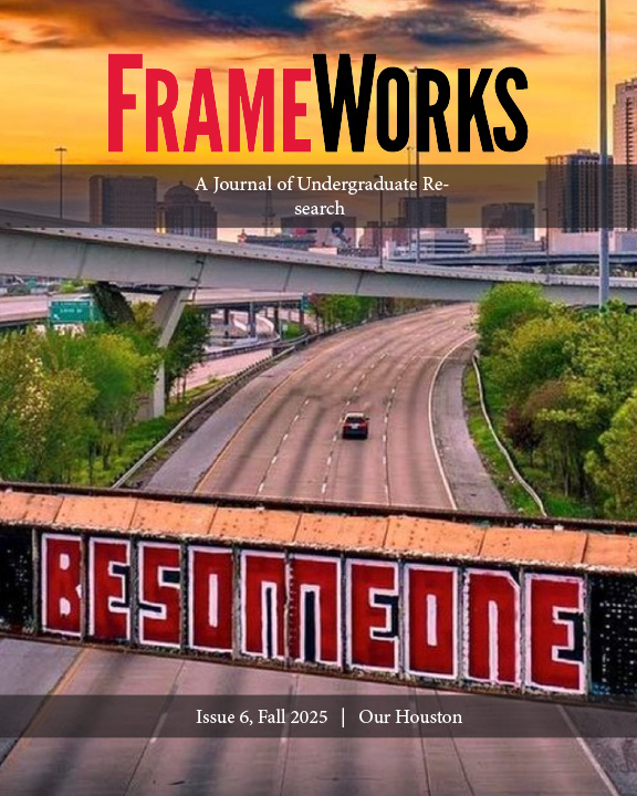 We proudly present the 6th Issue of FrameWorks: A Journal of Undergraduate Research in the Interdisciplinary Humanities. Over the 2024-2025 academic year and well into the summer, the FrameWorks Fellows worked hard to conceive, research, write, present, refine, and edit articles that addressed themes germane to the city in which we live and which our university serves. We are calling this the “Our Houston” edition.