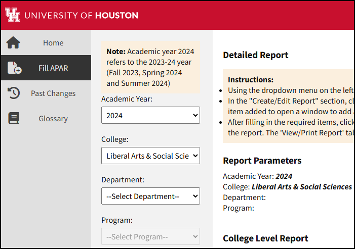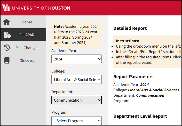 - Using the dropdown menus, select the Academic Year, College, Department, and Program as appropriate.