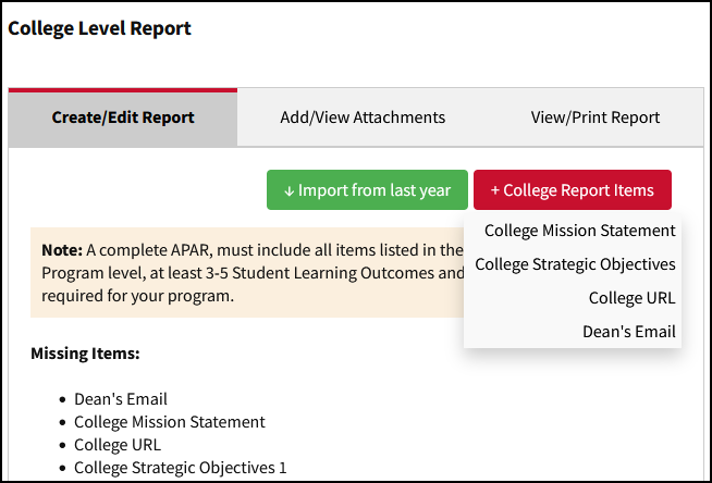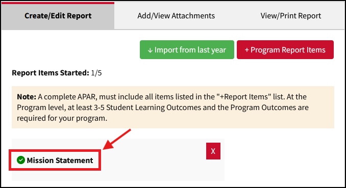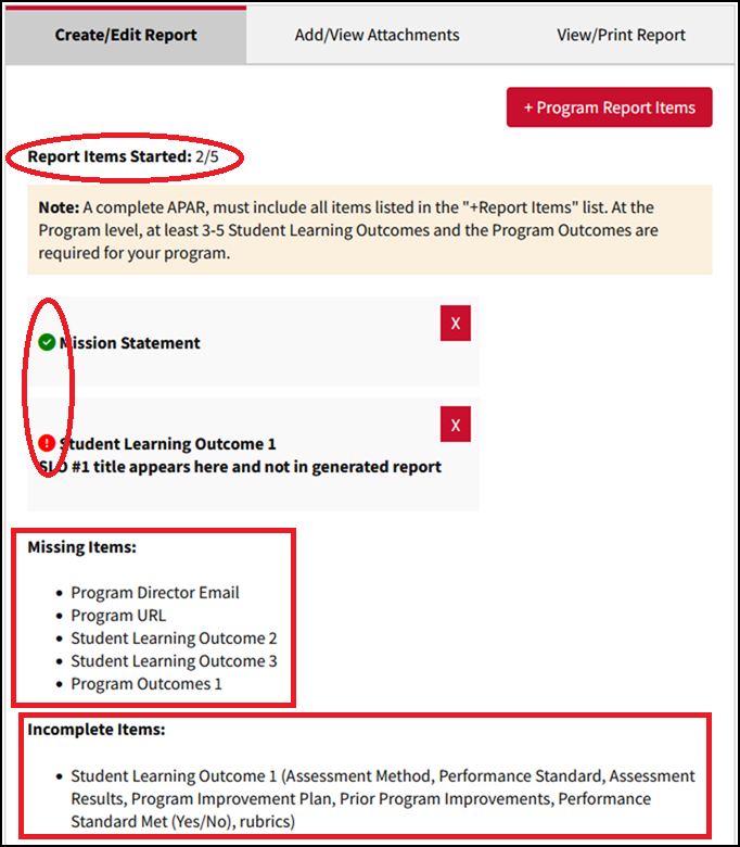 The Create/Edit Report tab includes various elements to help you quickly see the status of various items in the report such as the number of items started, which items are missing, and incomplete parts of each item.