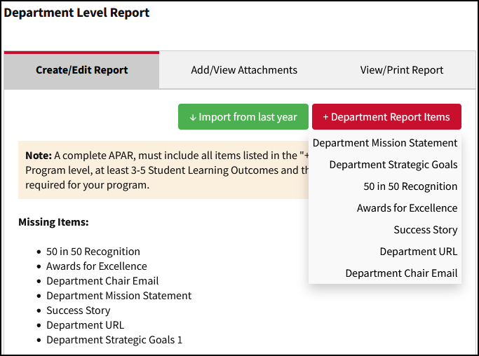 The “Import from last year” button in the Create/Edit Report tab will copy all sections from the previous year for the selected report.