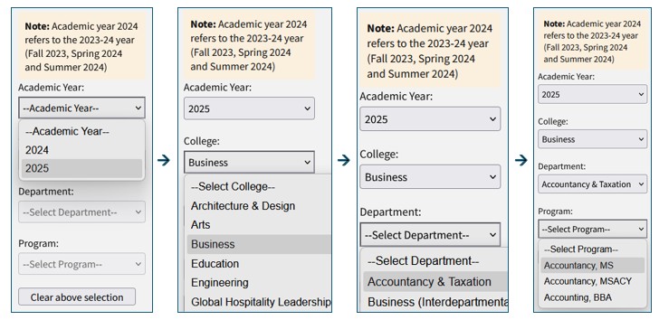 - Select academic year, college, department, and program