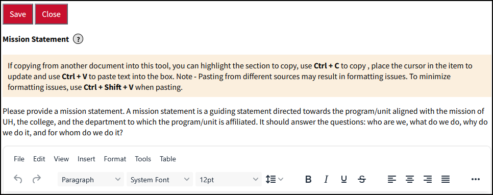 - Items that are used multiple times in the report (e.g. Student Learning Outcomes and Program Outcomes) will appear in the report in the order they are created. For example, the first Student Learning Outcome you create will appear as “Student Learning Outcome 1” and will be printed first in the Student Learning Outcome section.