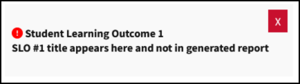 If you include your rubric in other sections of the SLO and leave the Rubrics (Optional) field blank, the SLO item will appear with a red exclamation mark; however, this will not result in the item being listed as missing or incomplete.