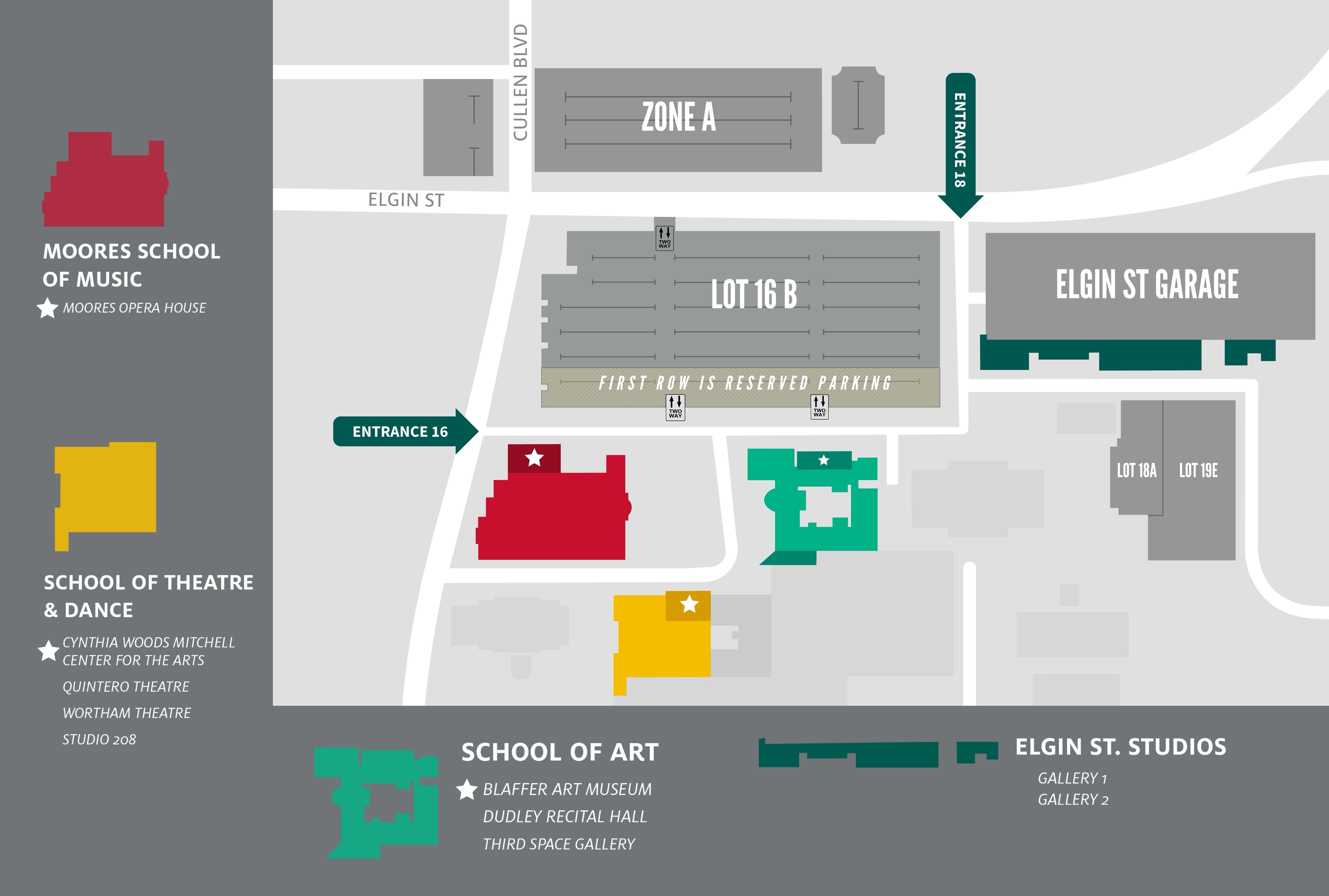 • Exit Cullen Blvd → Right on Cullen → Left on Elgin St → Parking entrance on right