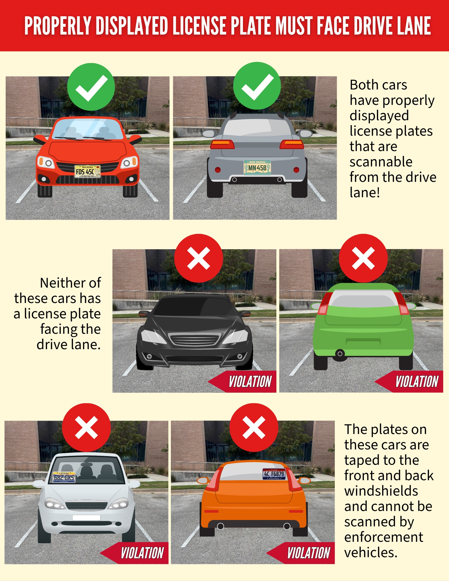 - If a vehicle does not have a front license plate, or the front license plate is affixed to the windshield or dashboard, then the rear license plate must be facing the drive lane, as shown in the first photo below.