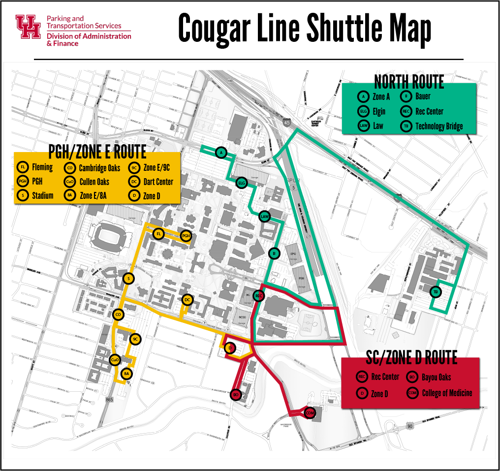 - Shuttle Stops: Rec Center-South, Zone D, Bayou Oaks, College of Medicine