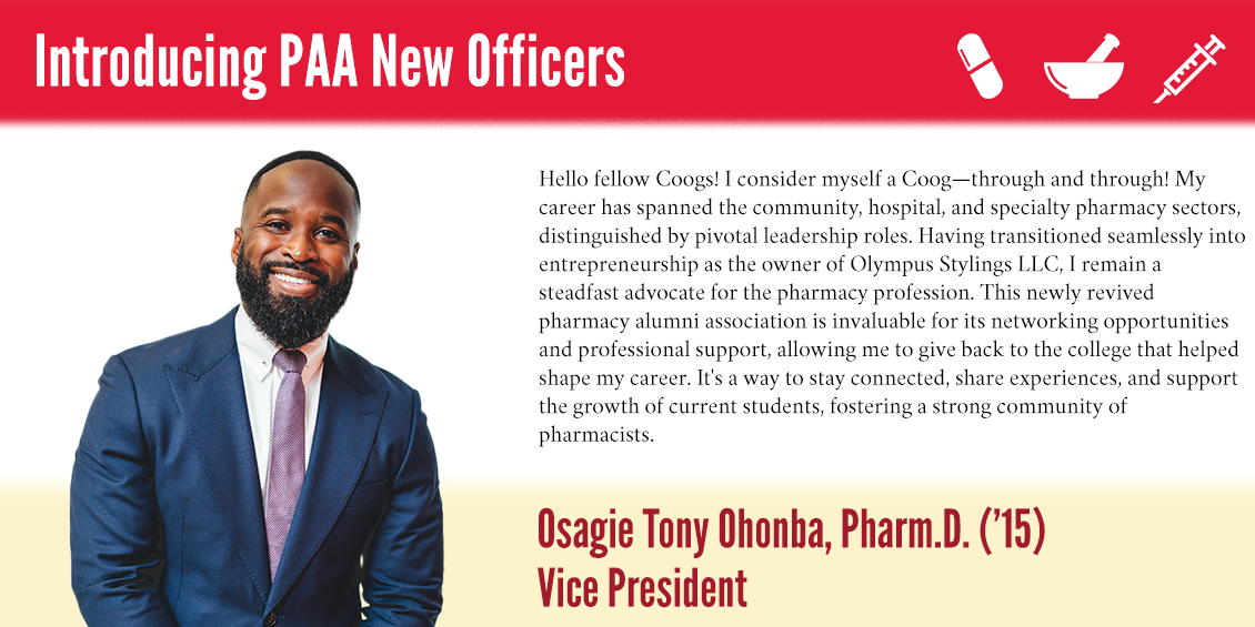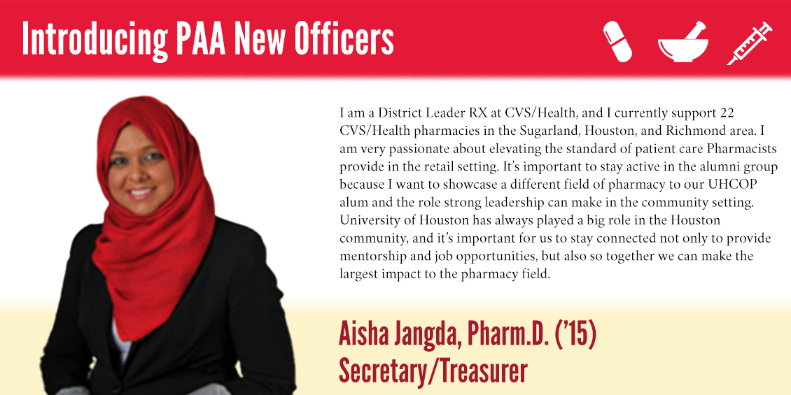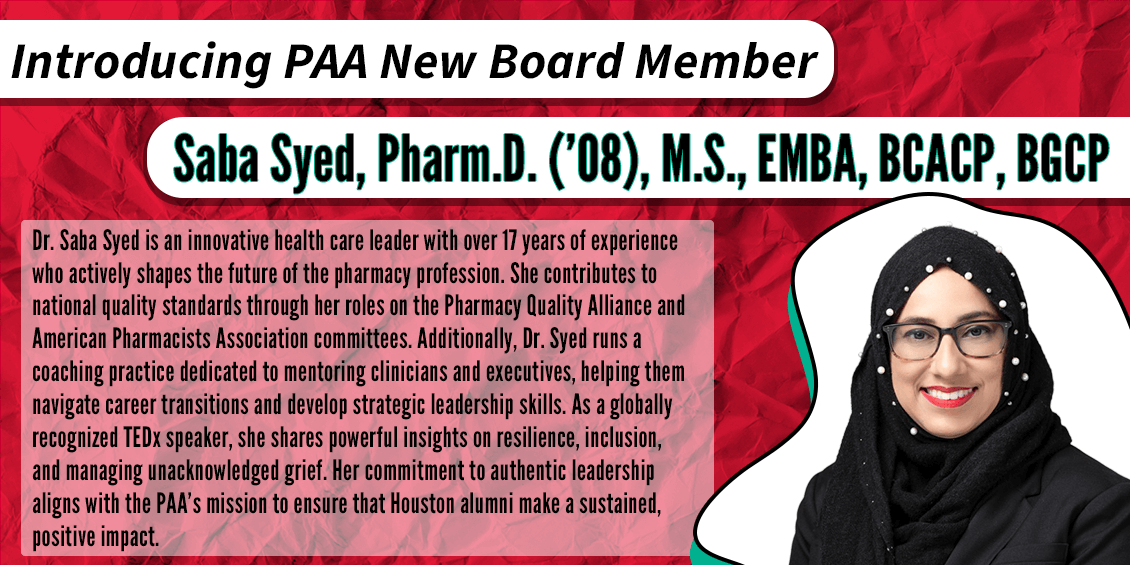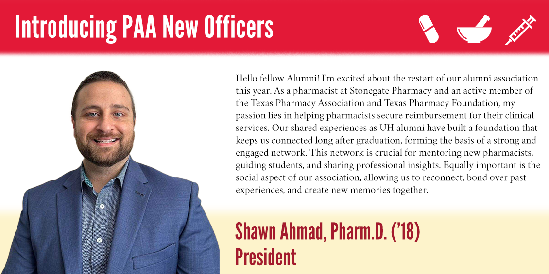 The UH Pharmacy Alumni Association (PAA) is a constituent group of The University of Houston Alumni Association (UH Alumni), a non-profit organization that represents more than 18,000 alumni members across the globe.